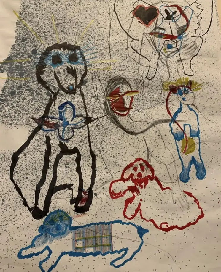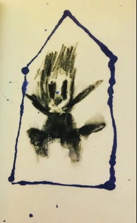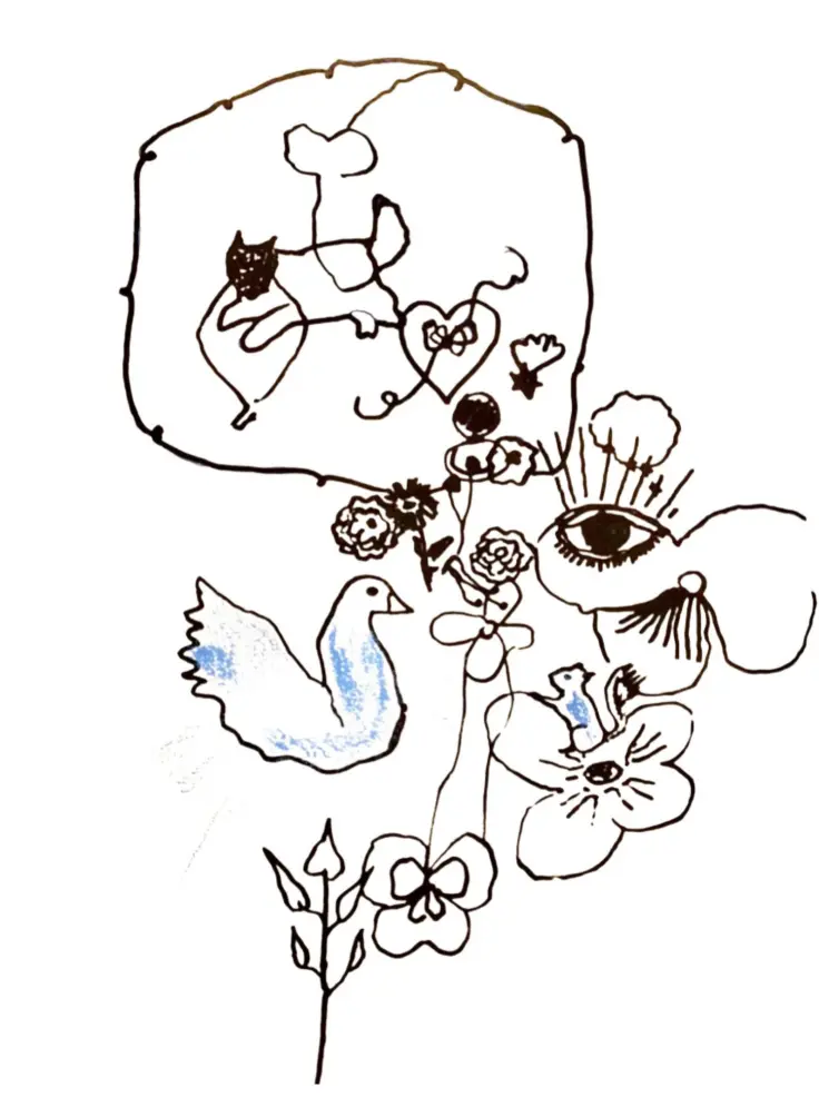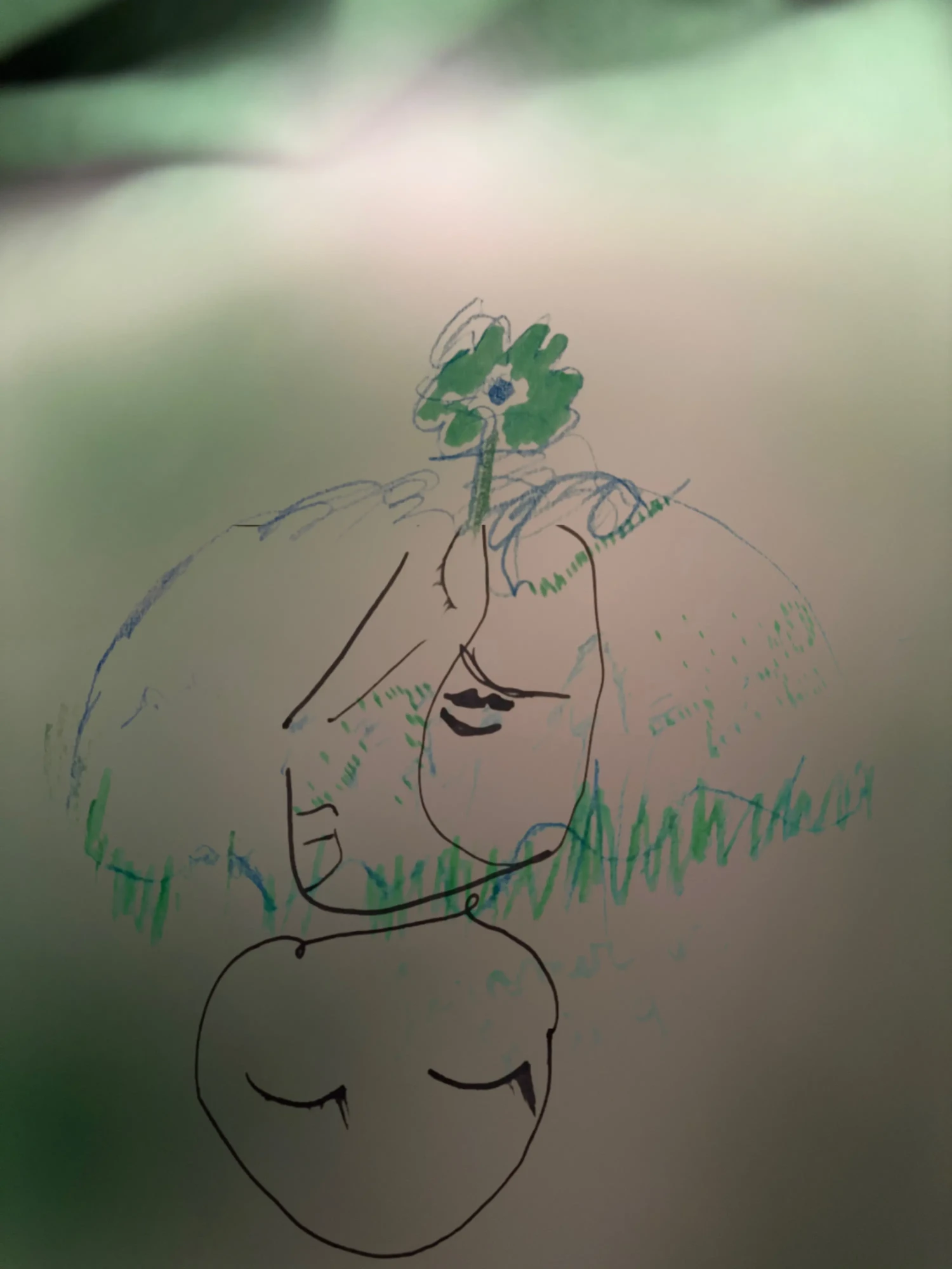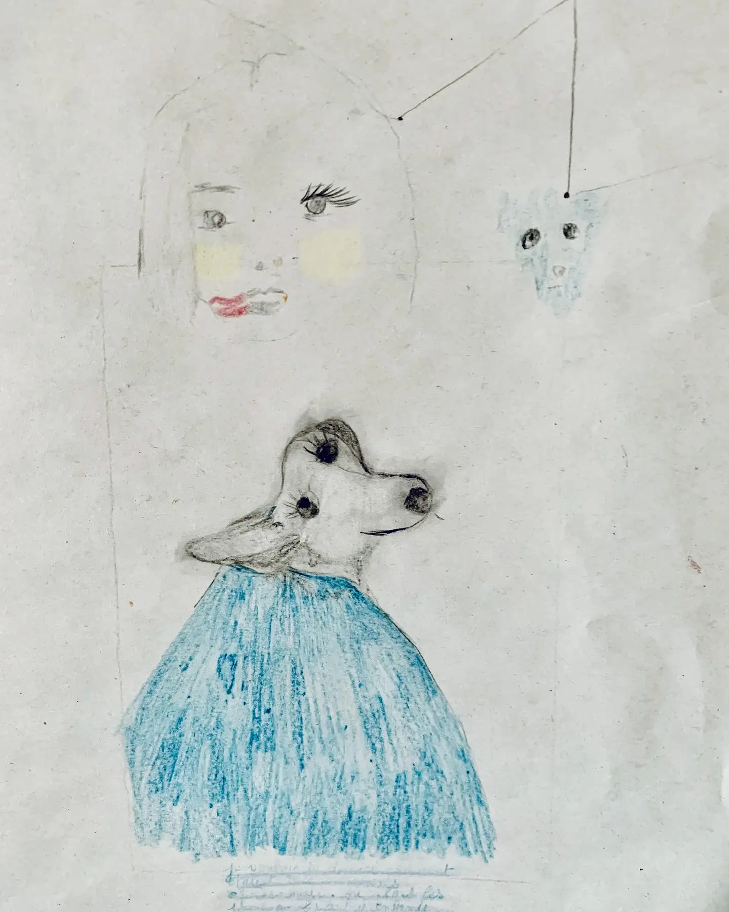 Des débuts de mini histoires bleues, traversées par un filtre bleu qui décalerait radicalement le quotidien, la perception de soi et de l’autre. Une après-midi avec le Seigneur Epouvante. Dessin, crayons de couleurs
