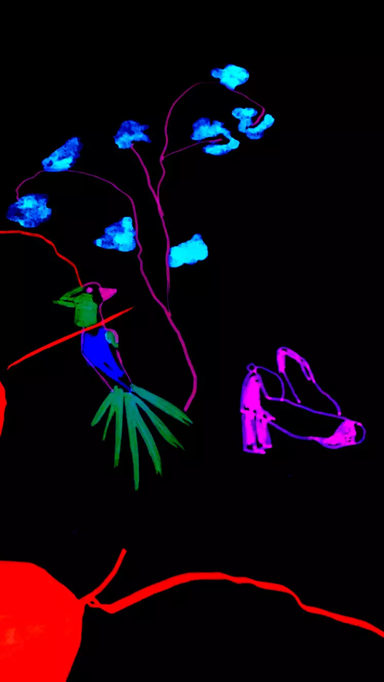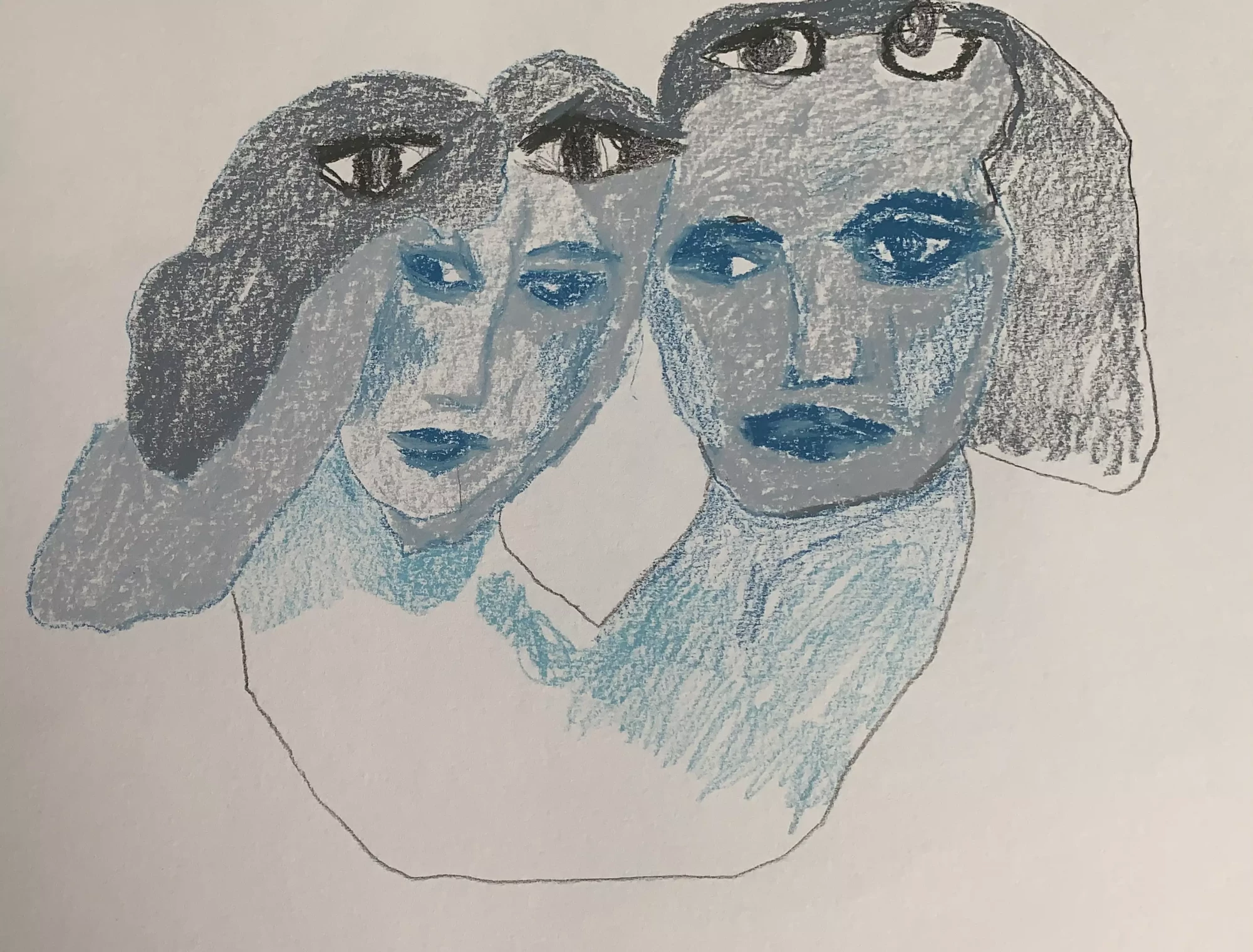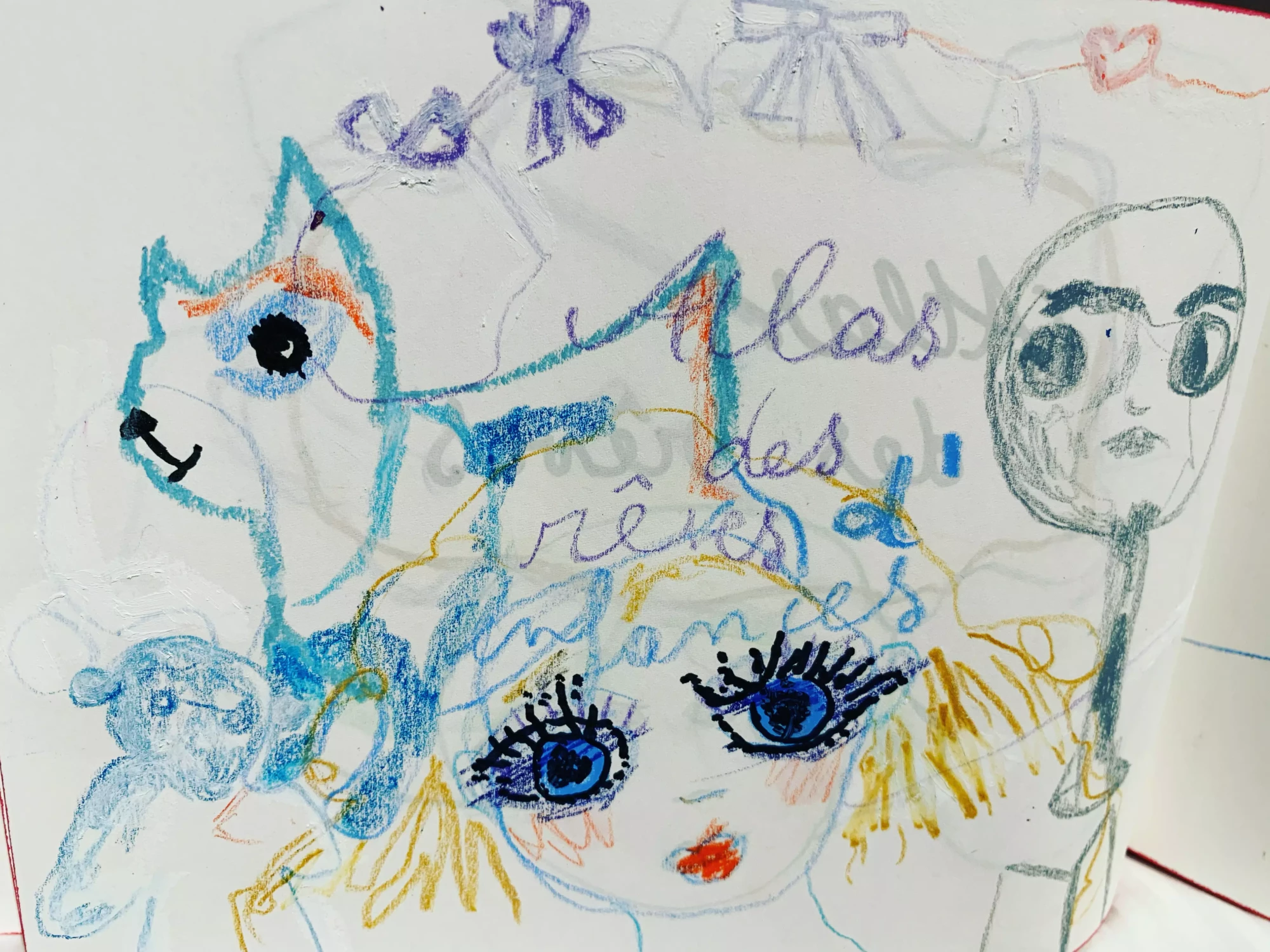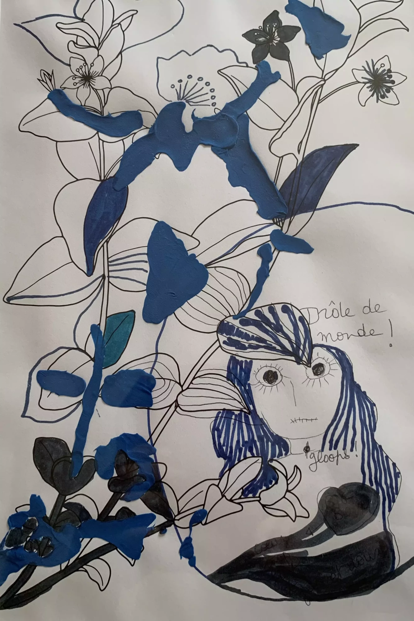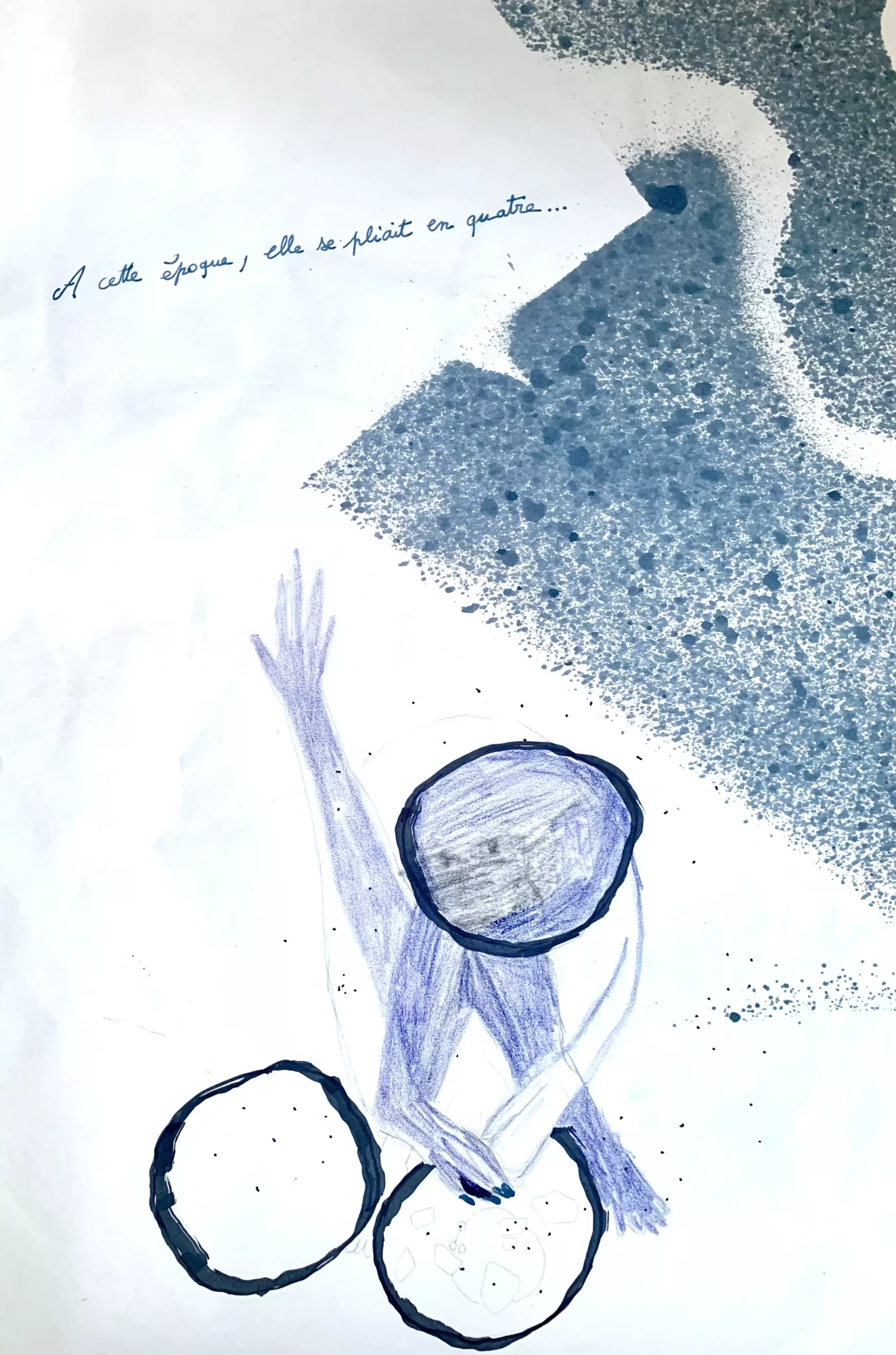 Des débuts de mini histoires bleues, traversées par un filtre bleu qui décalerait radicalement le quotidien, la perception de soi et de l’autre. Une après-midi avec le Seigneur Epouvante. Dessin, crayons de couleurs